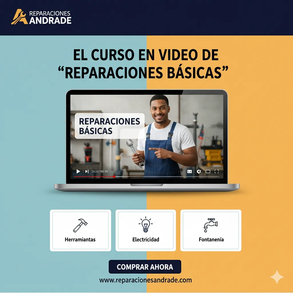 Este es un producto tangible en formato de tarjeta o caja con un código de acceso a una plataforma de video. El curso incluye tutoriales en alta definición que le enseñarán a reparar un grifo que gotea, a desatascar una tubería, a arreglar un enchufe o a colgar un cuadro correctamente. Es una forma de compartir el conocimiento y la profesionalidad de Reparaciones Andrade, empoderando a sus clientes con habilidades prácticas que pueden ahorrarles tiempo y dinero. Un regalo perfecto para un nuevo propietario de vivienda.
